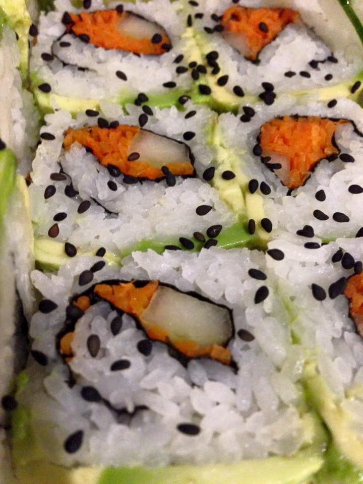 Shari, alga nori, queso crema, pepino, aguacate topping ajonjolí mixto