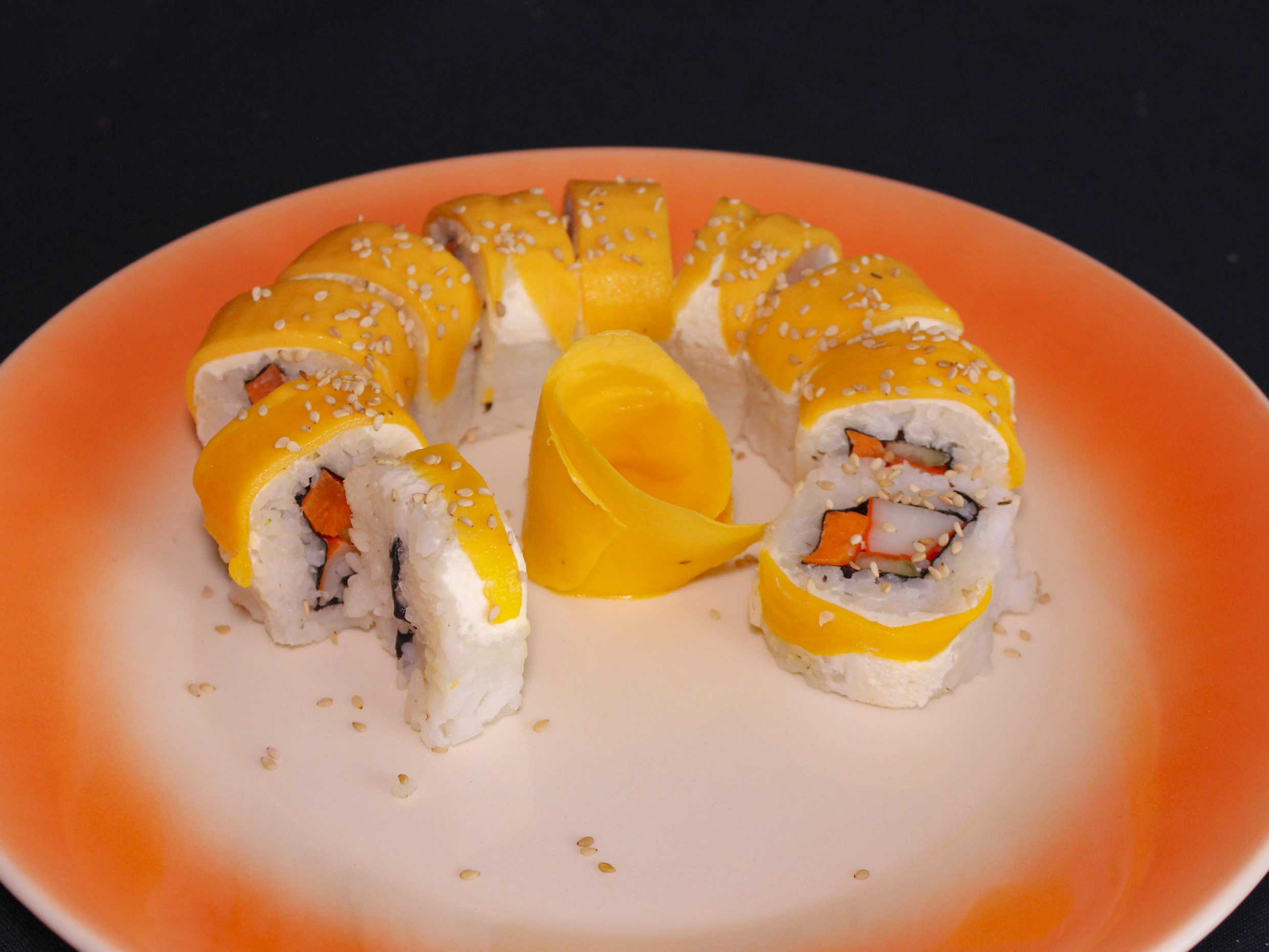 Shari, camarón empanizado, queso crema, cobertura de mango, salsa de maracuyá e hilos de camote frito