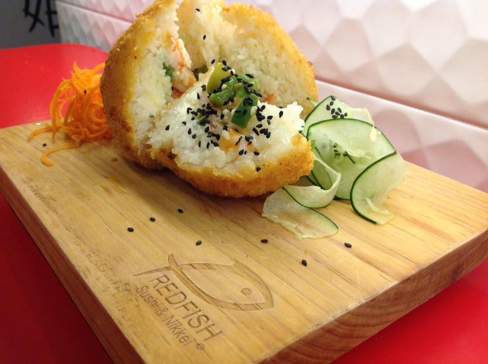 Bolas de arroz empanizadas y fritas;Rellena de aguacate, queso crema, salmón y tare