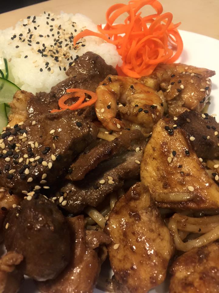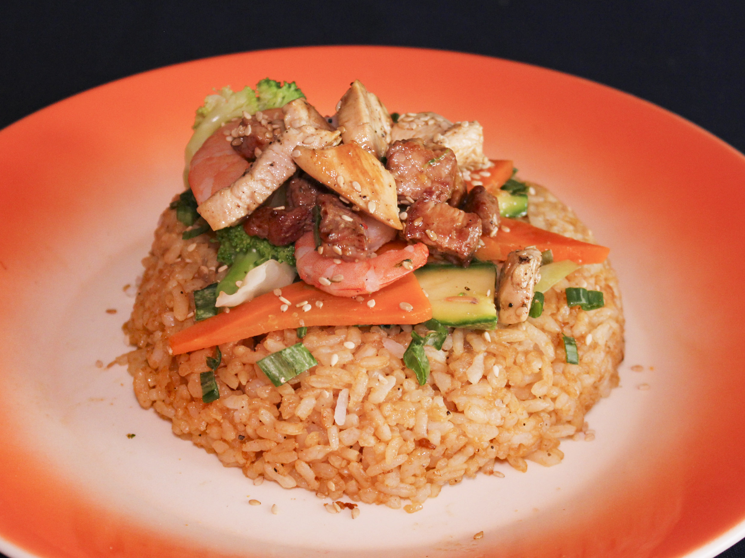Arroz frito japonés, pollo, res y camarón marinado en salsa teriyaki