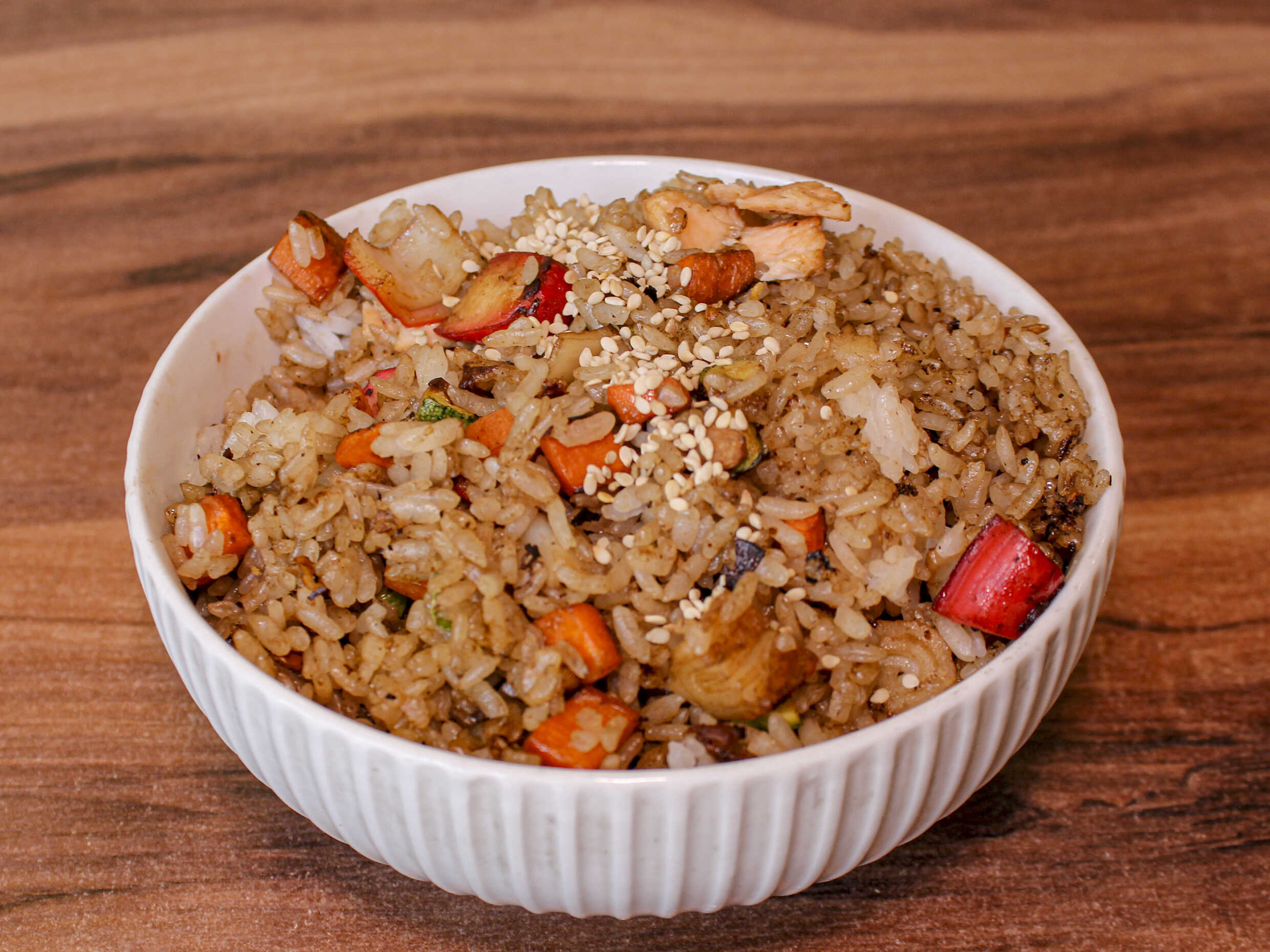 Arroz frito con pachikay (aderezo chino), huevo, pimiento morrón y cebollín