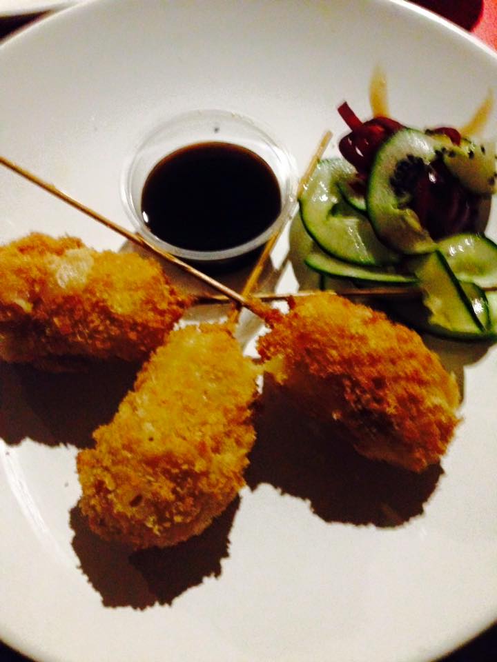 Bolas de arroz empanizadas y fritas; Rellena de aguacate, queso crema, arrachera en salsa shoyu y ajonjolí