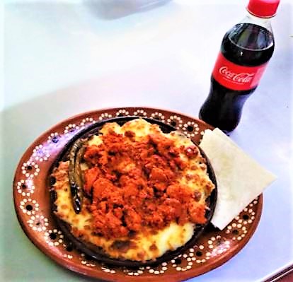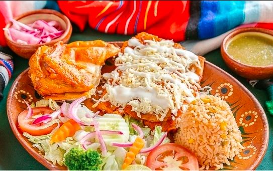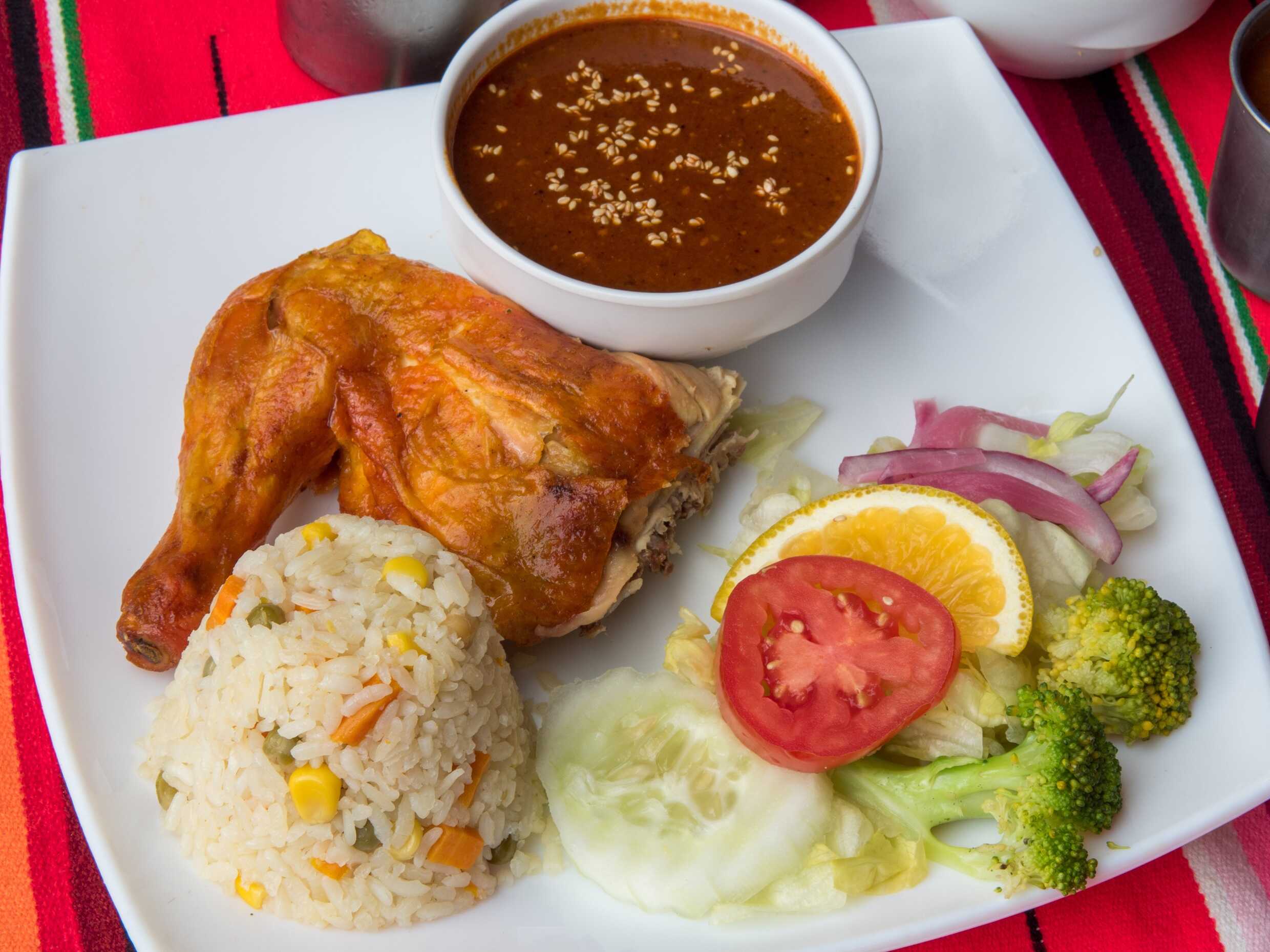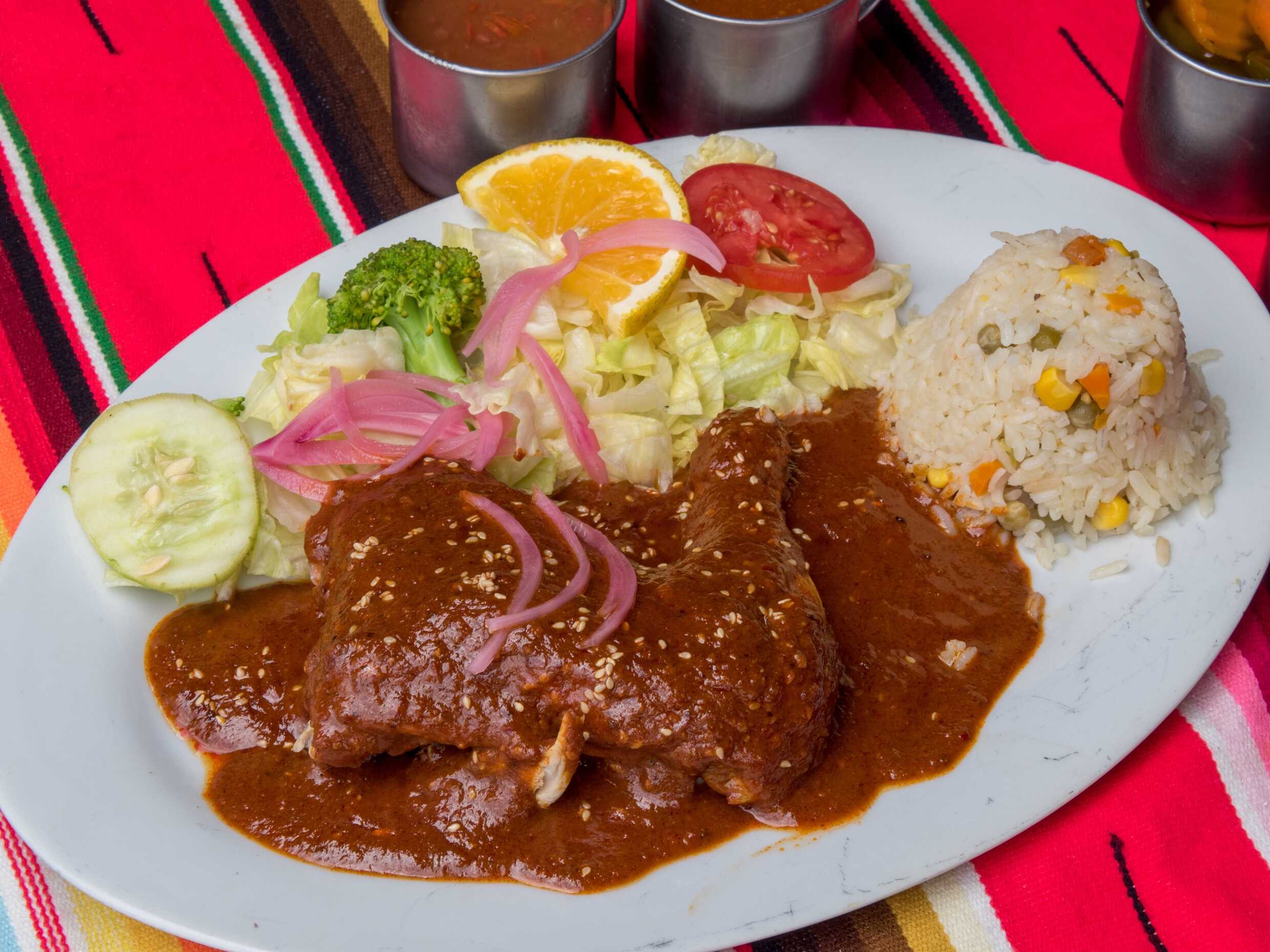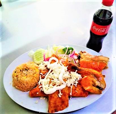 3 Tortillas grandes del comal, bañadas en nuestro tradicional mole, con pollo, arroz y ensalada.
