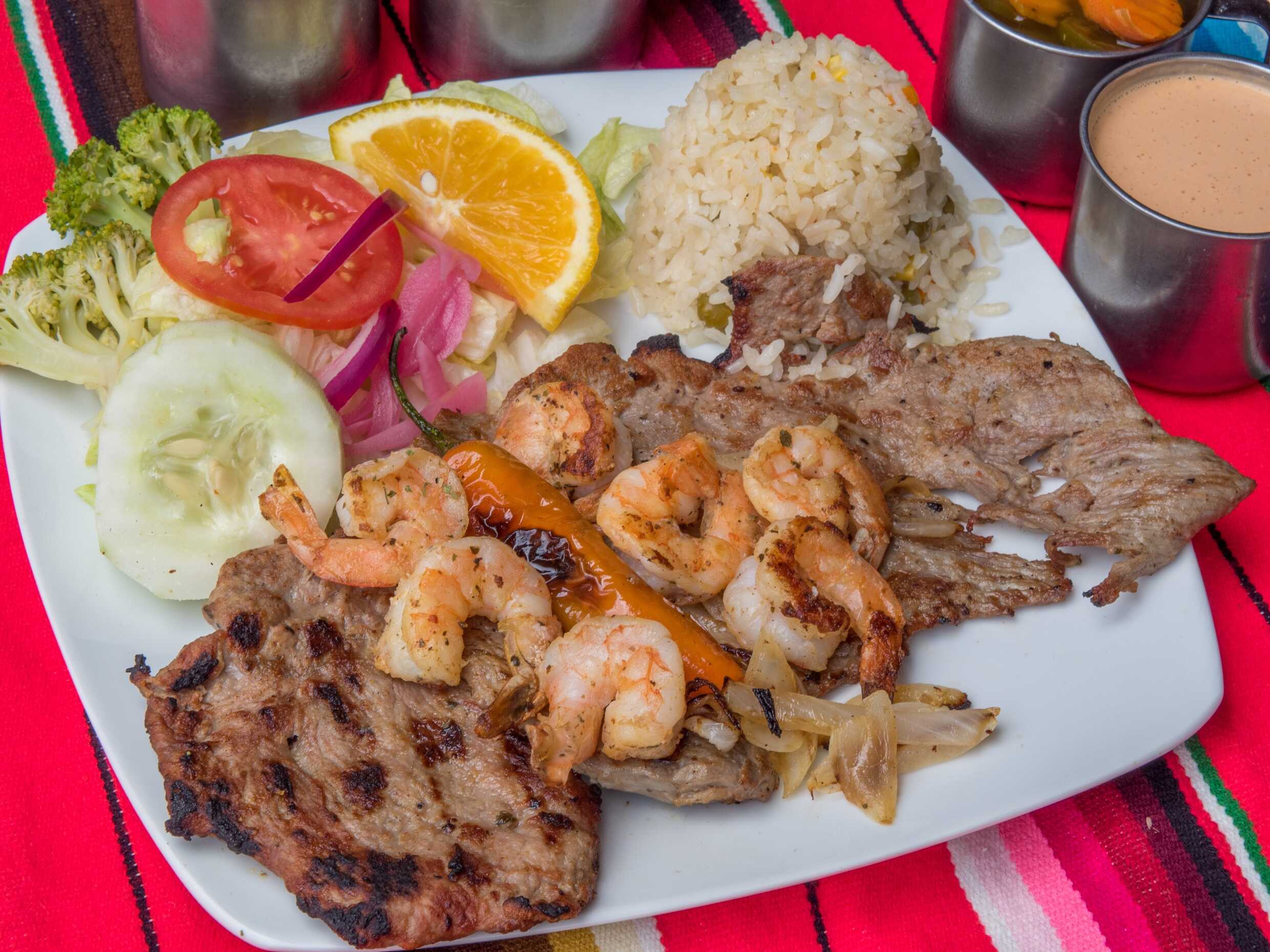 200 gr de arrachera o rib eye, 100 gr de camarones a la plancha.