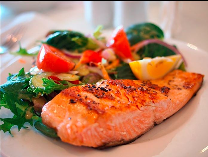 250 Gr de exquisito salmón a la plancha con finas hierbas y aceite de oliva, con ensalada.