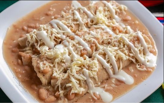 3 Enfrijoladas de tortilla grande del comal con quesito y crema. Un guisado a elegir.