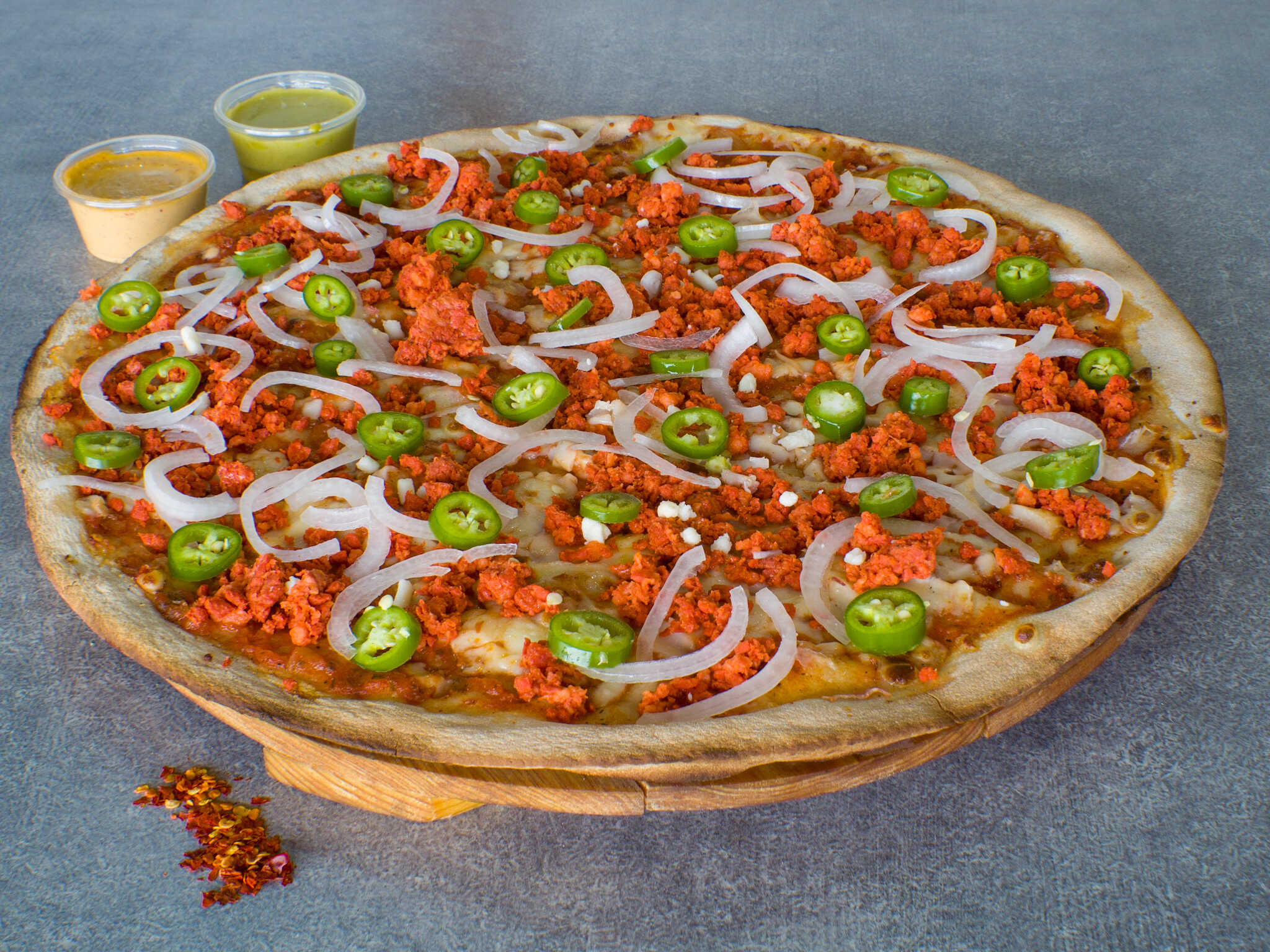 Pizza grande con 12 rebanadas con chorizo, cebolla y chile serrano con queso base de la casa.