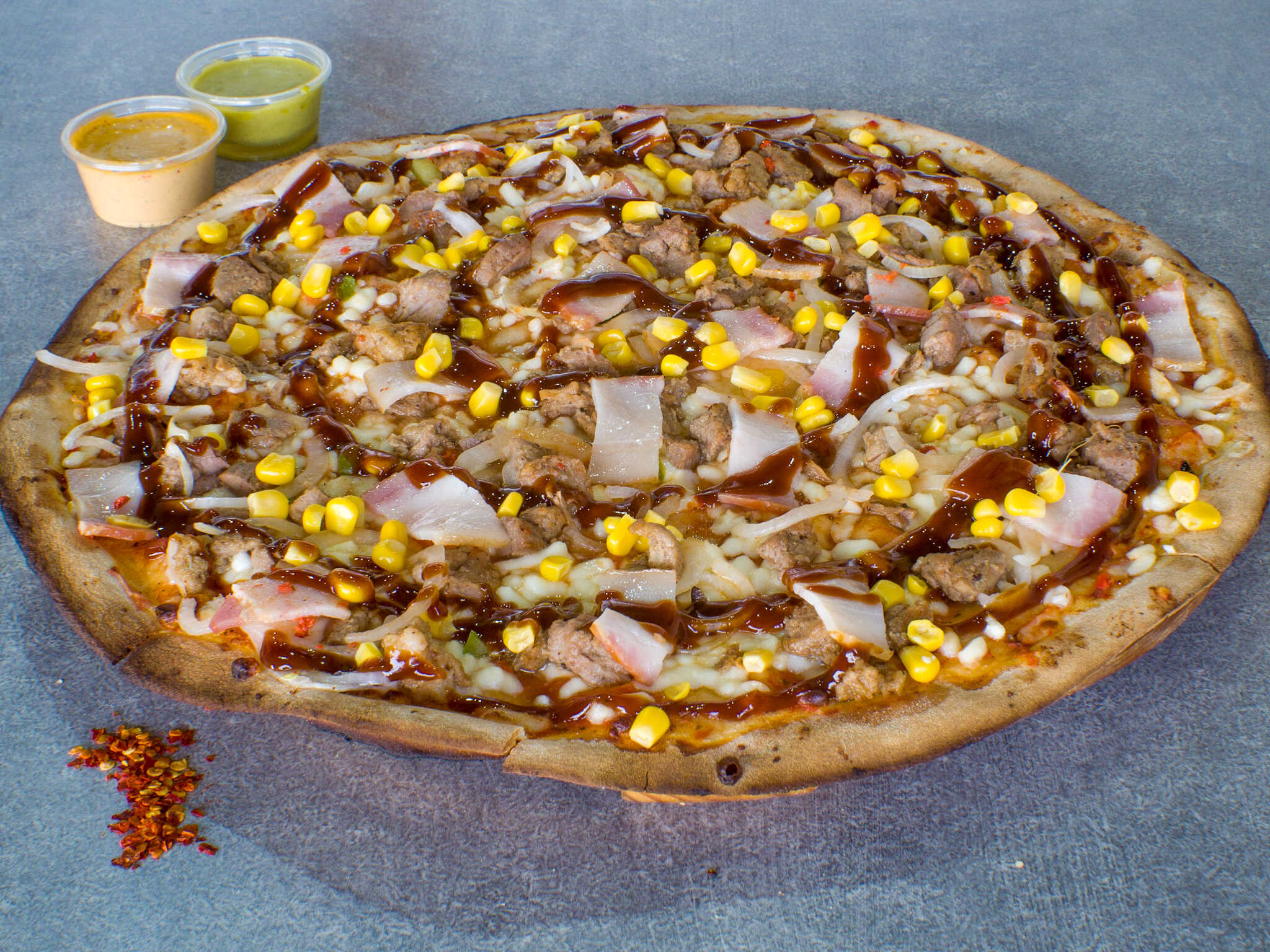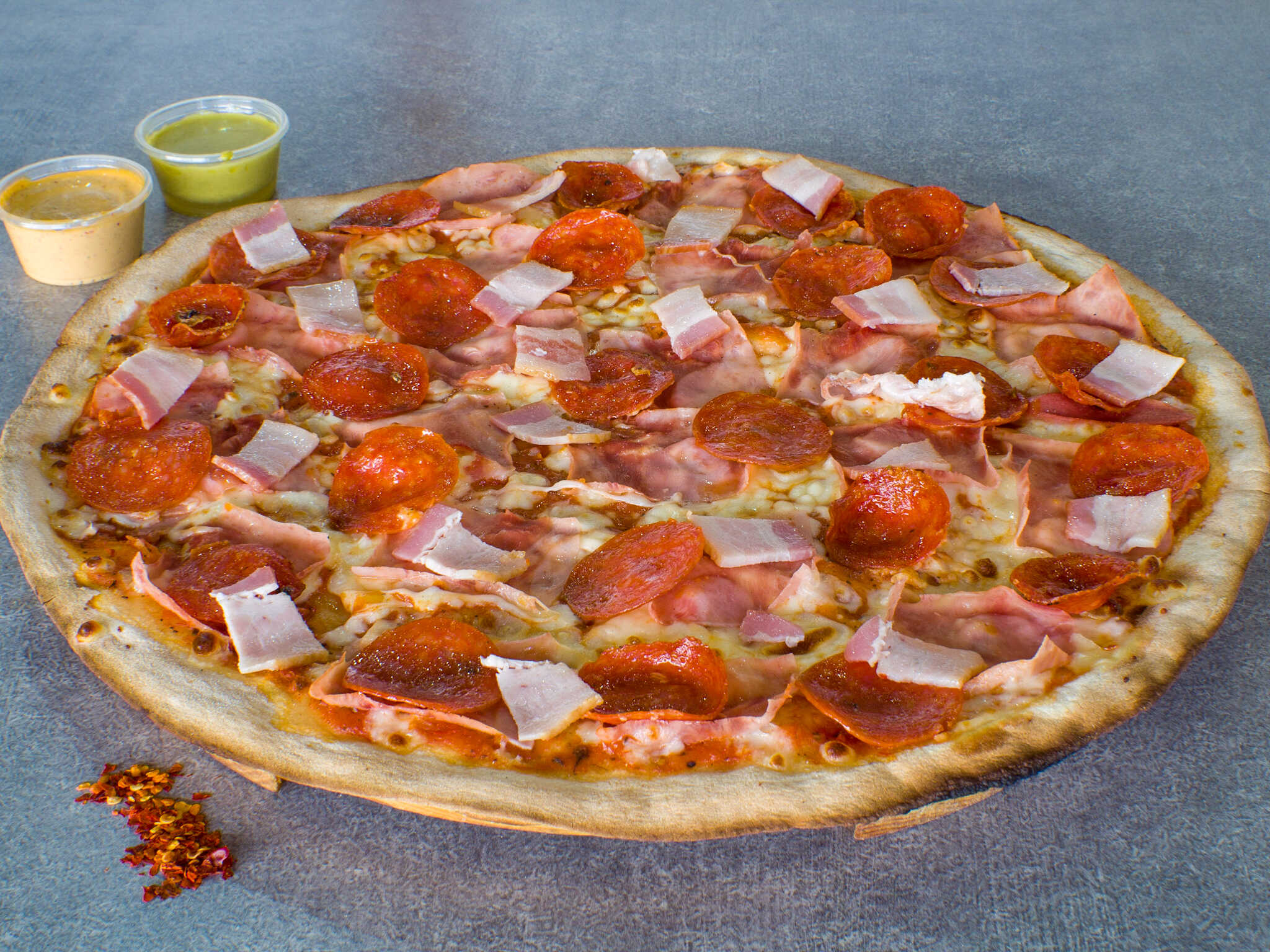 Pizza grande de 12 rebanadas con jamón, pepperoni y tocino con queso base de la casa.