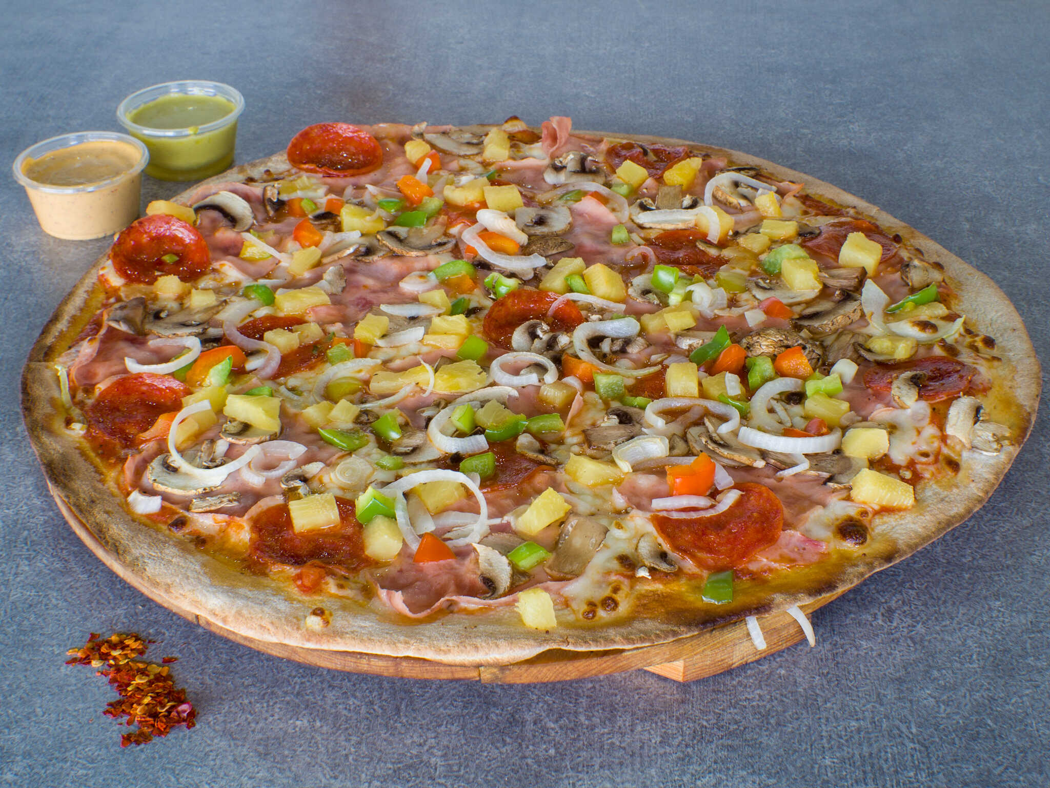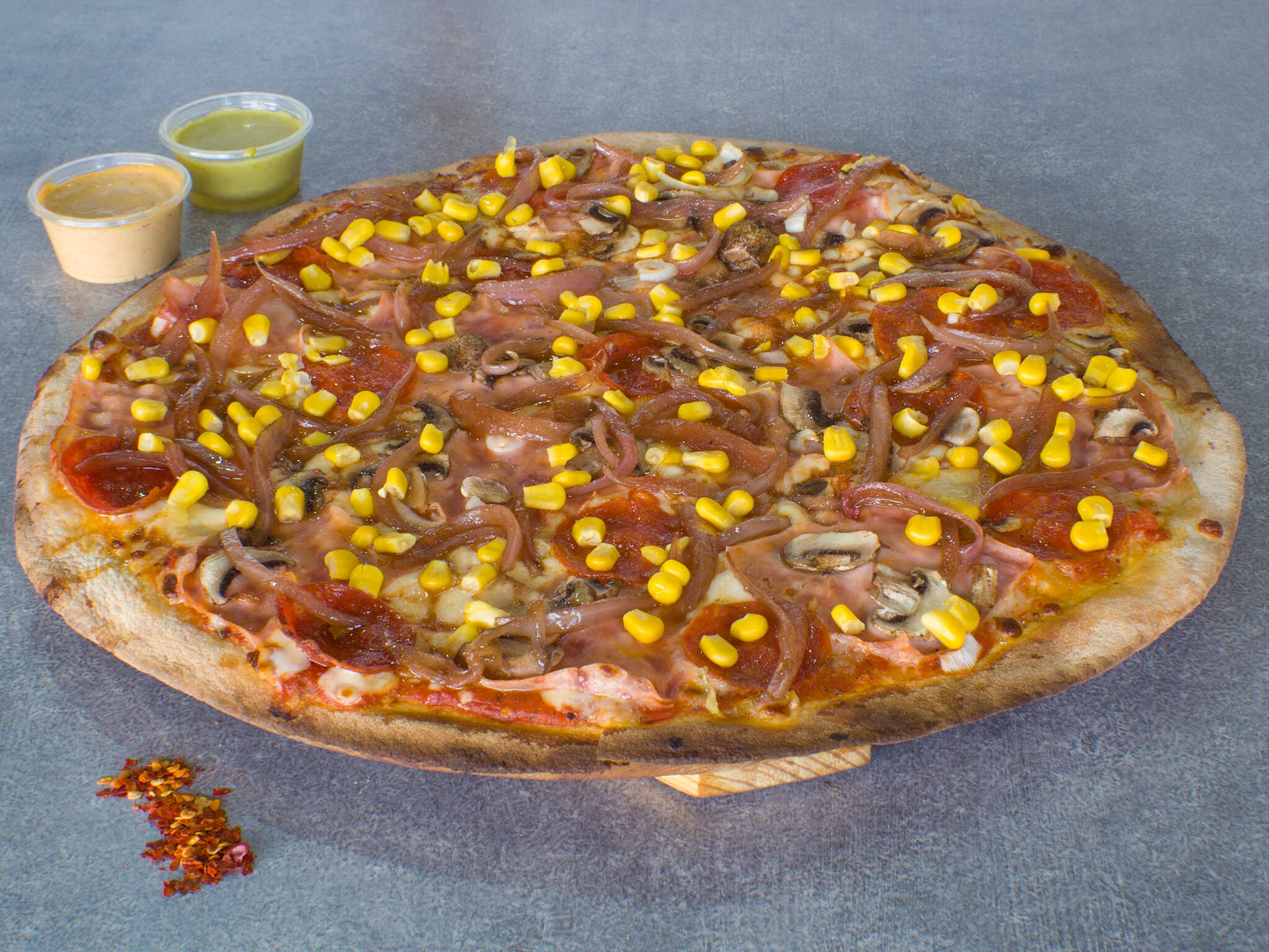 Jamón, pepperoni, champiñón natural y aceituna negra.