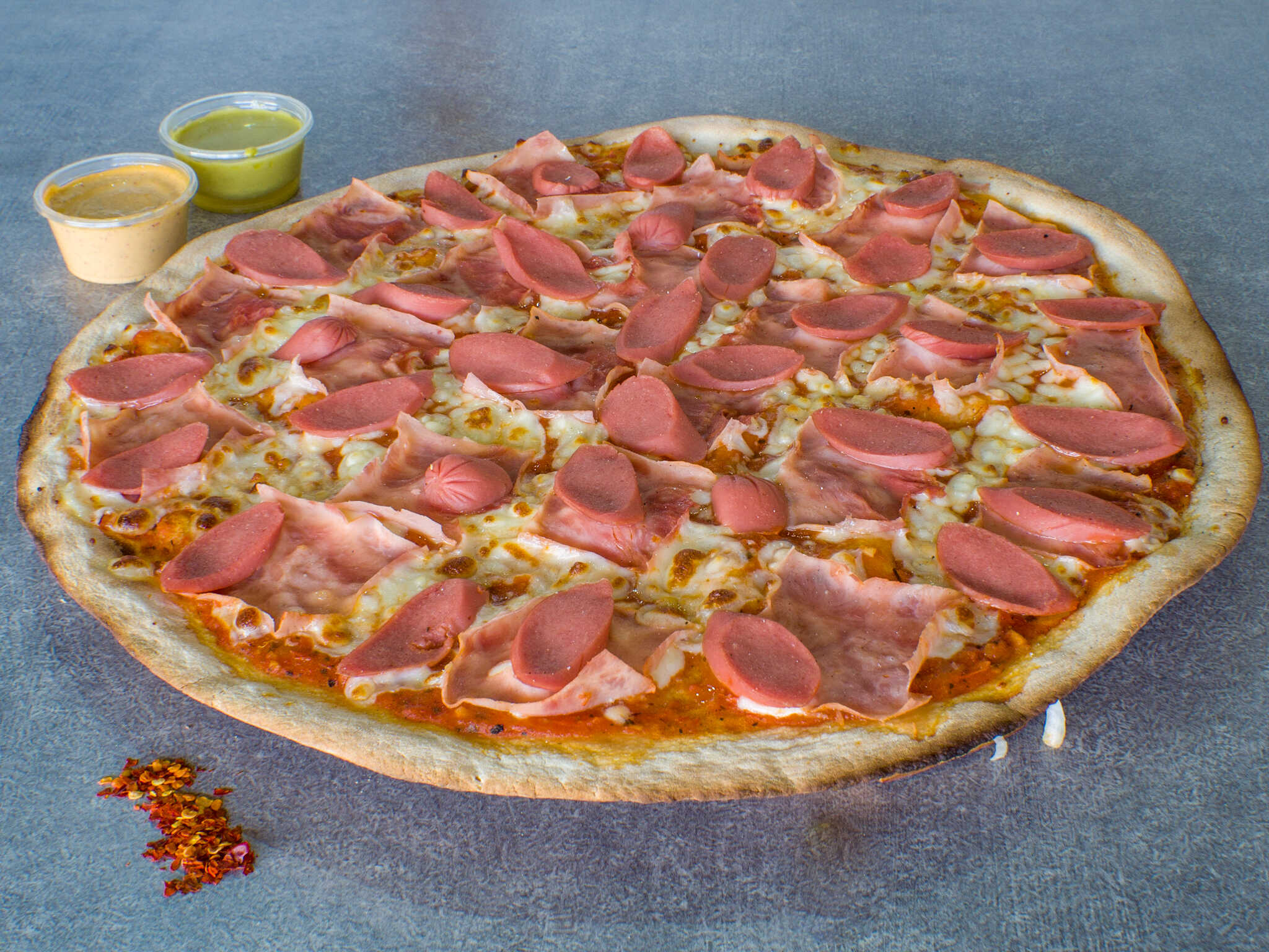 Pizza grande de 12 rebanadas con jamón y salchicha con queso base de la casa.