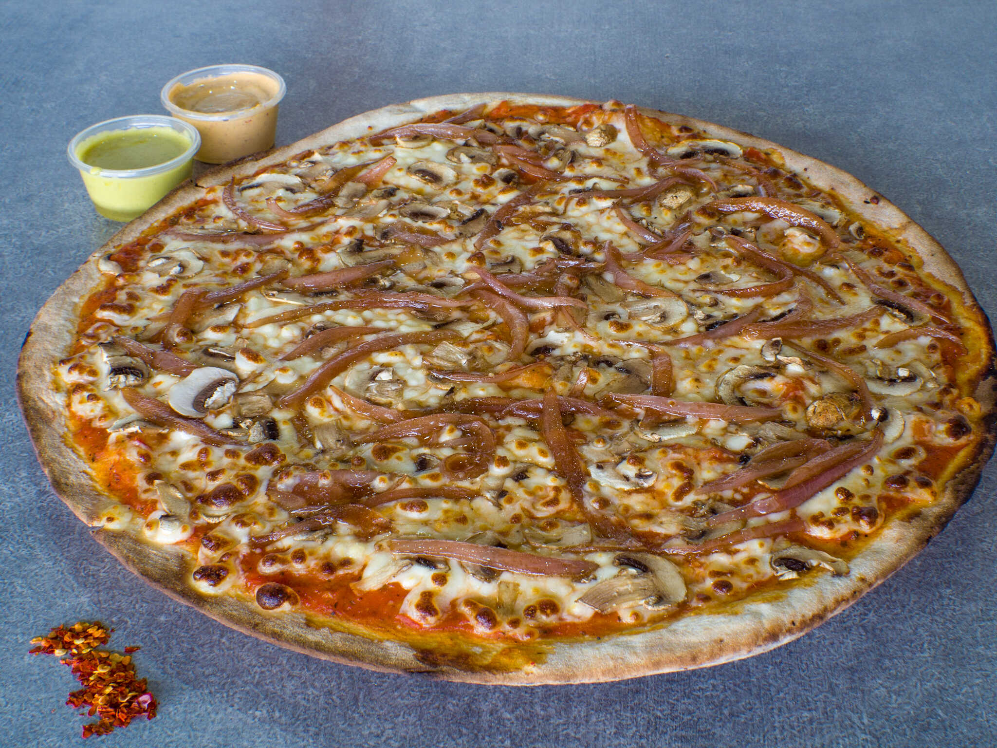 Pizza grande de 12 rebanadas con champiñón y cebolla caramelizada con queso base de la casa