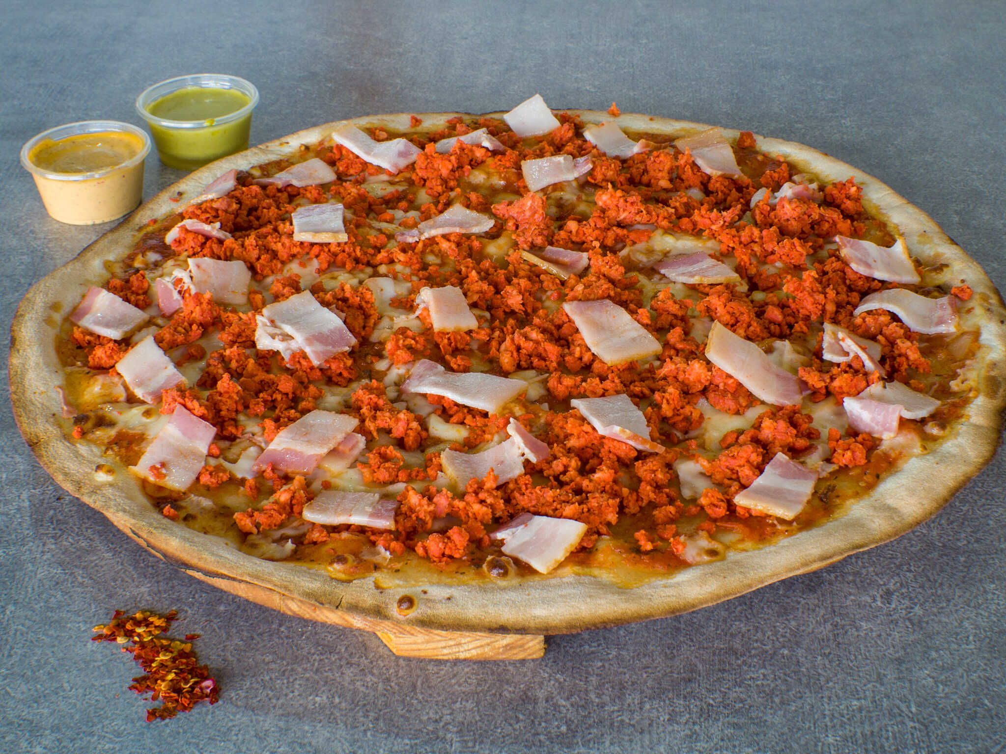 Pizza grande con 12 rebanadas con chorizo y tocino con queso base de la casa.