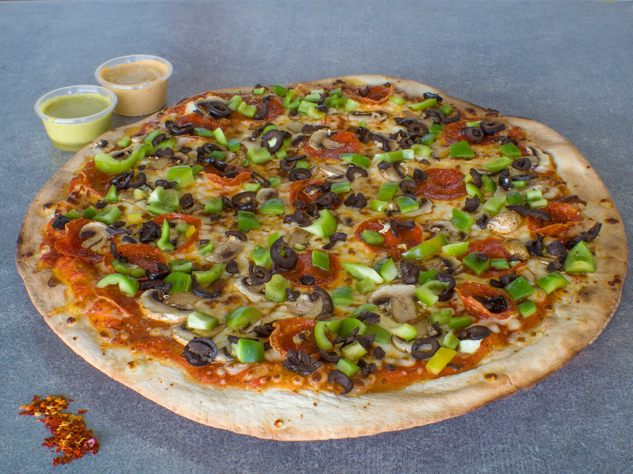 Pizza grande de 12 rebanadas con pepperoni, morrón, champiñón y aceitunas negras.
