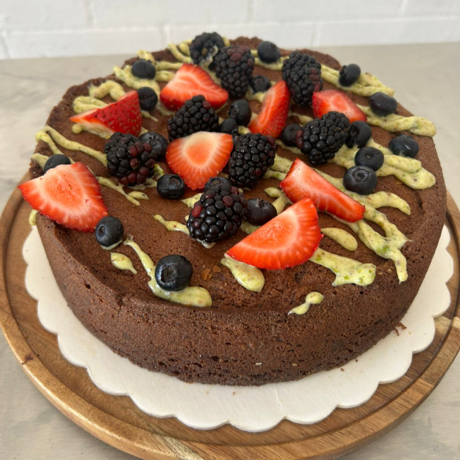 Pastel de chocolate a base de harina de almendra, mucho chocolate semiamargo y decorado con salsa de pistache y frutos rojos