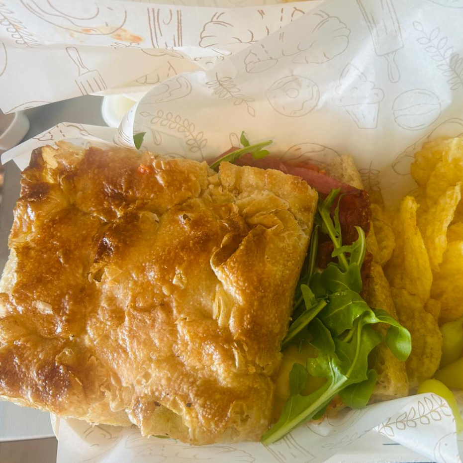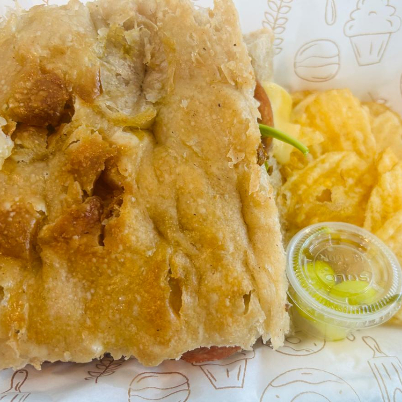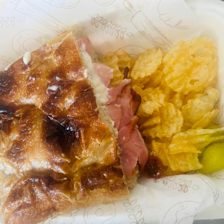 Pan recien horneado en casa, jamon 100 % de pierna, queso holandes y crema de aceituna. Incluye papas fritas