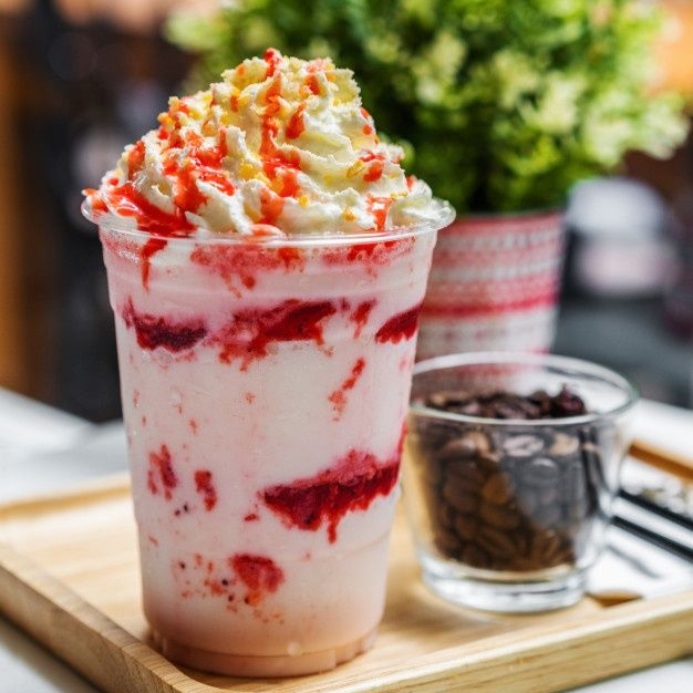 Bebida a base de yogur griego, fresas, azucar y crema batida