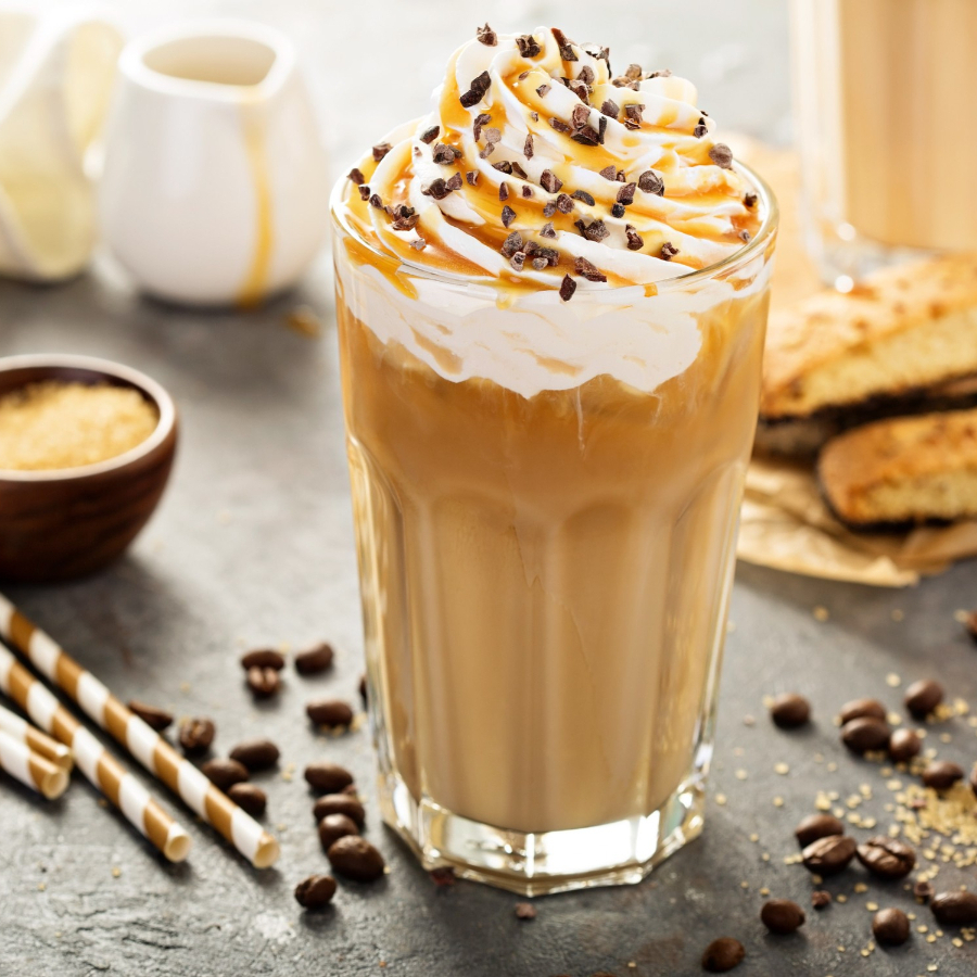 Shot de cafe, leche, caramelo y hielos con crema batida y mas caramelo