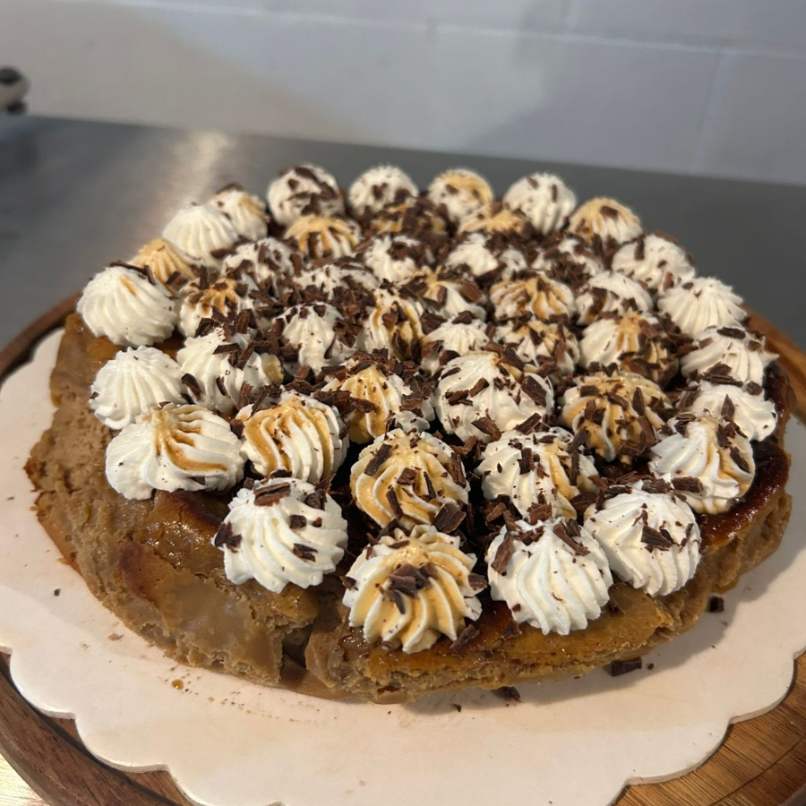 Cheesecake vasco sabor cafe, decorado con crema de vainilla y chocolate