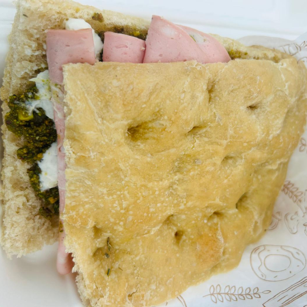 Pan recien horneado en casa, mortadela de pistache, queso stracciatela y crema de pistache. Incluye papas fritas