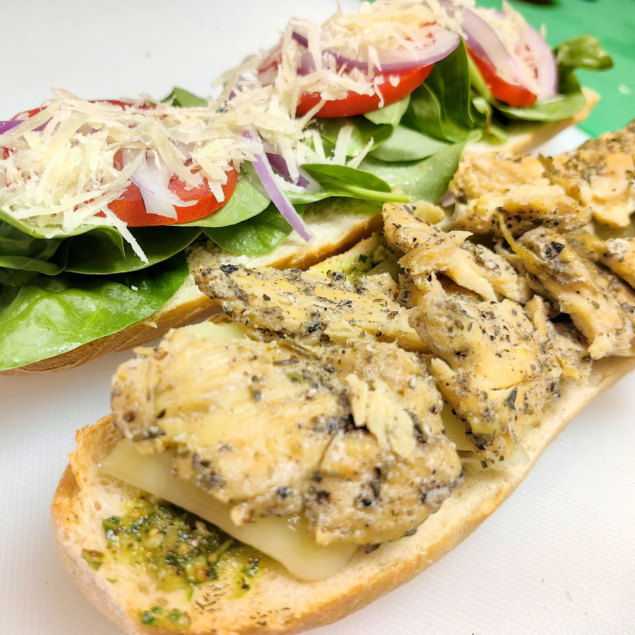 Pan de masa madre, pollo provenzal, pesto albahaca (puede contener nueces y piñones), queso parmesano, queso monterrey jack, espinaca baby, cebolla morada, jitomate, y vinagreta (puede contener miel de abeja).