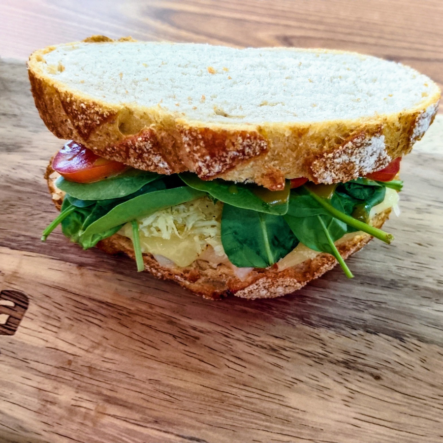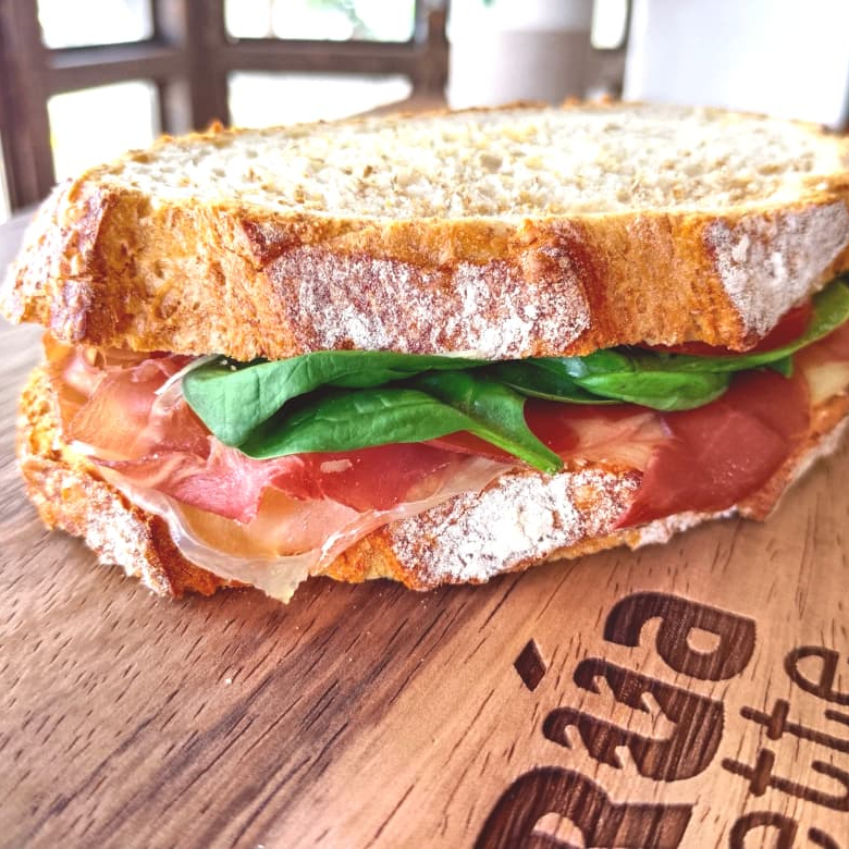 Pan de masa madre. prosciutto, pesto (puede contener nueces y piñones), queso monterrey jack, parmesano, espinaca baby, jitomate, cebolla morada, vinagreta (puede contener miel de abeja).