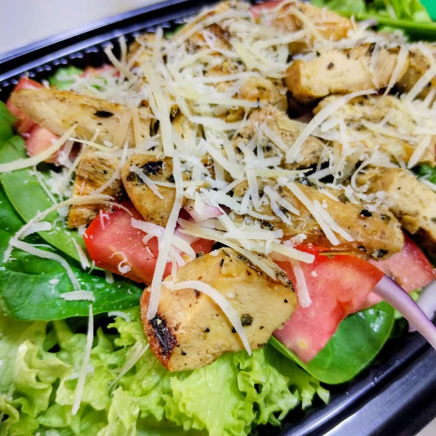 Pollo a la parrilla a la provenzal, lechuga italiana, espinaca baby, jitomate, cebolla, parmesano, vinagreta y crutons.