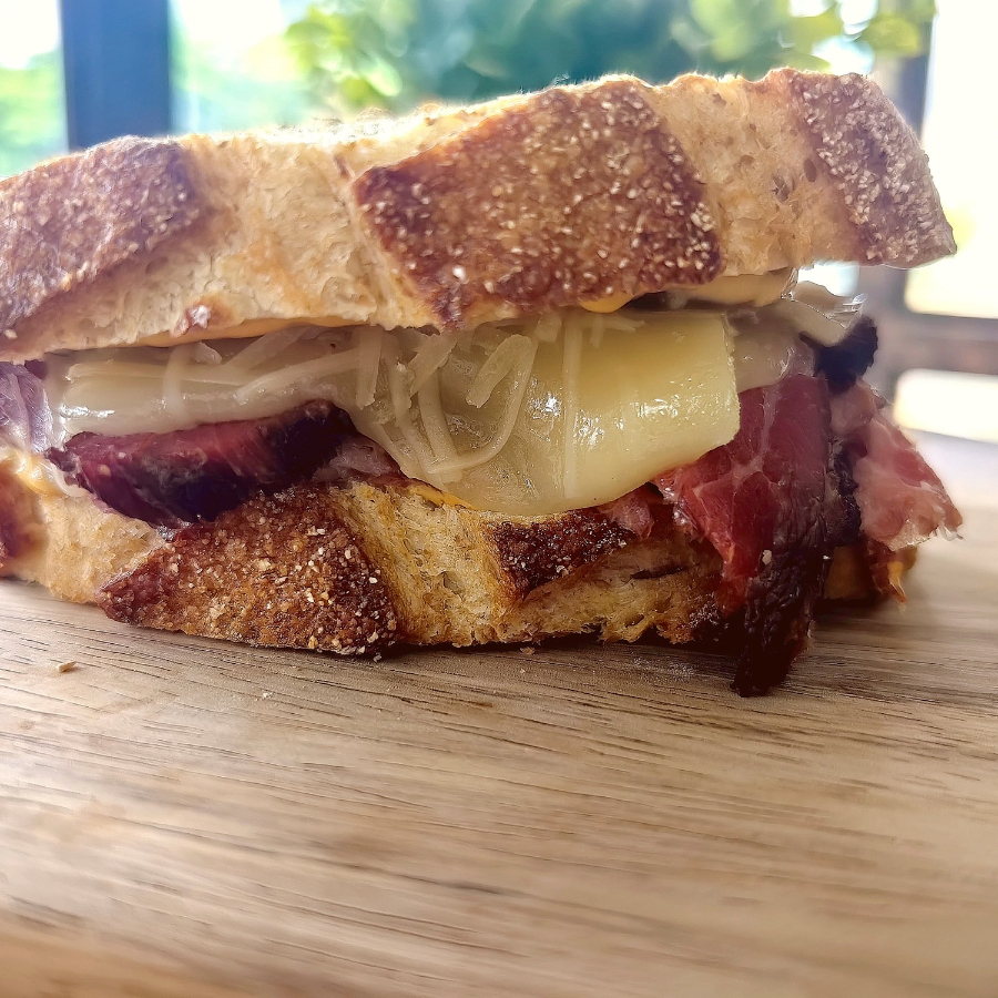 La joya de la corona, pan de masa madre, brisket curado por 10 días y ahumado por 14 horas, queso monterrey jack, queso parmesano, pepinillos, aderezo.