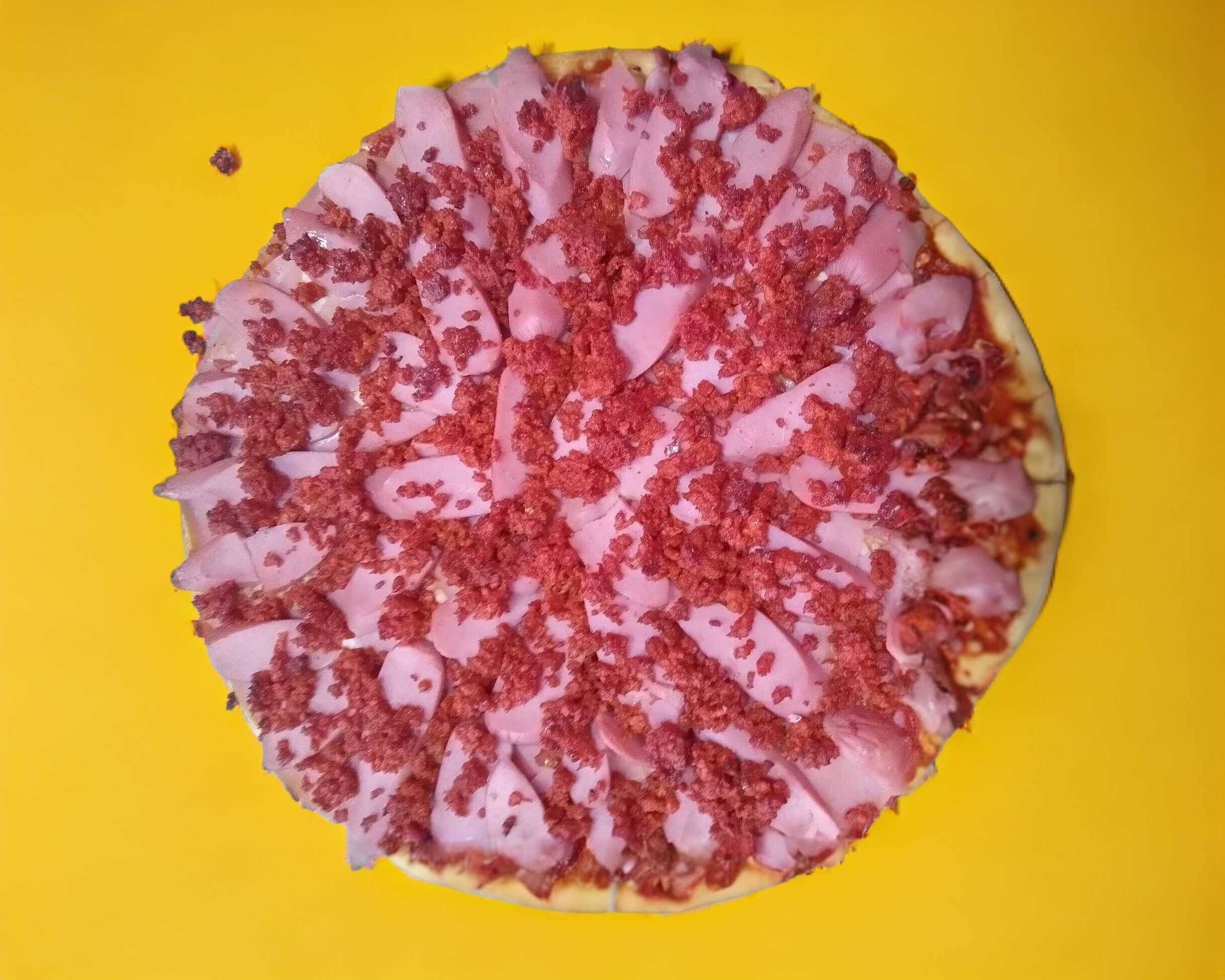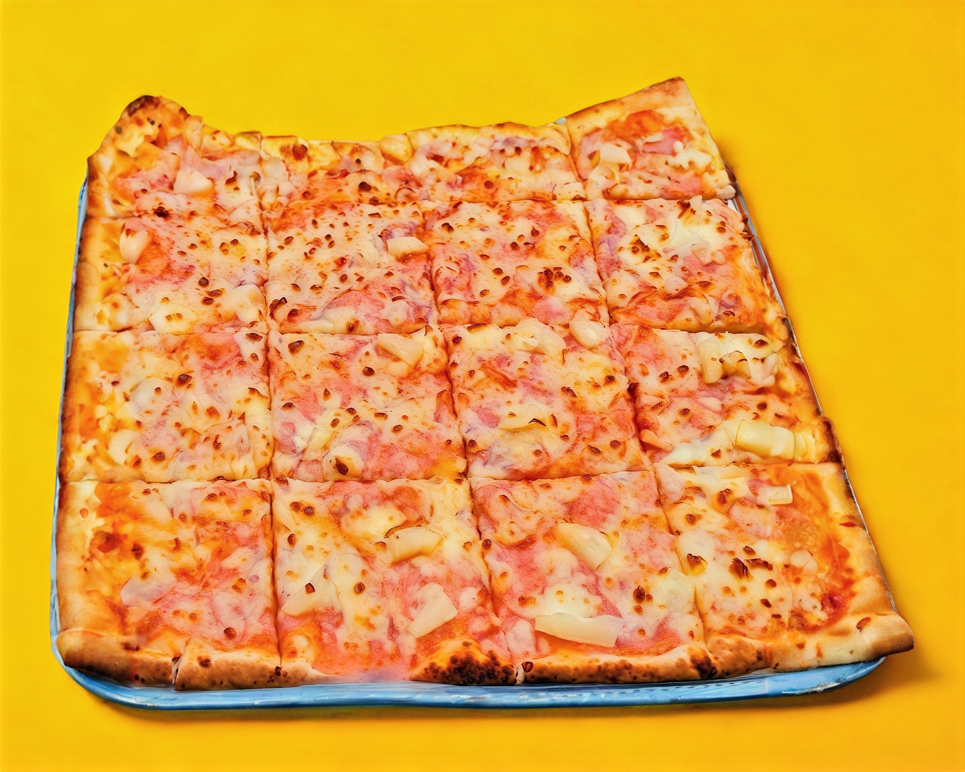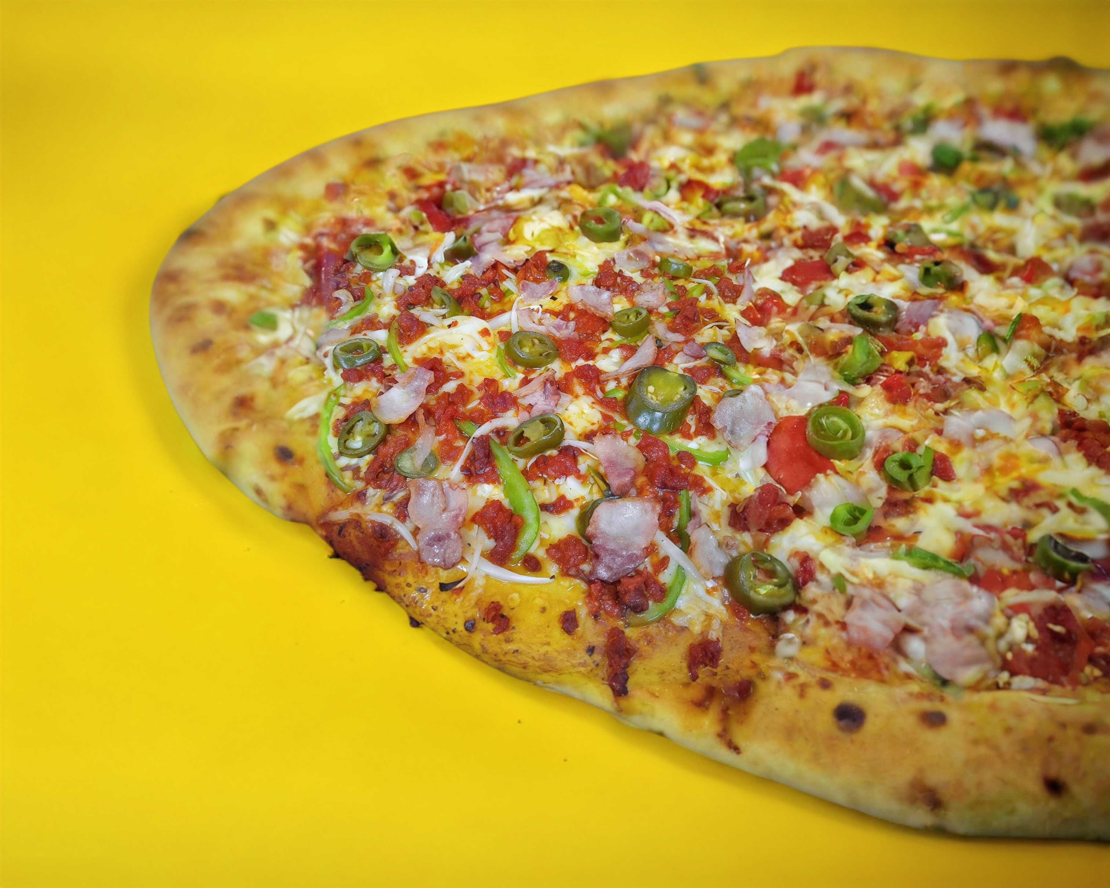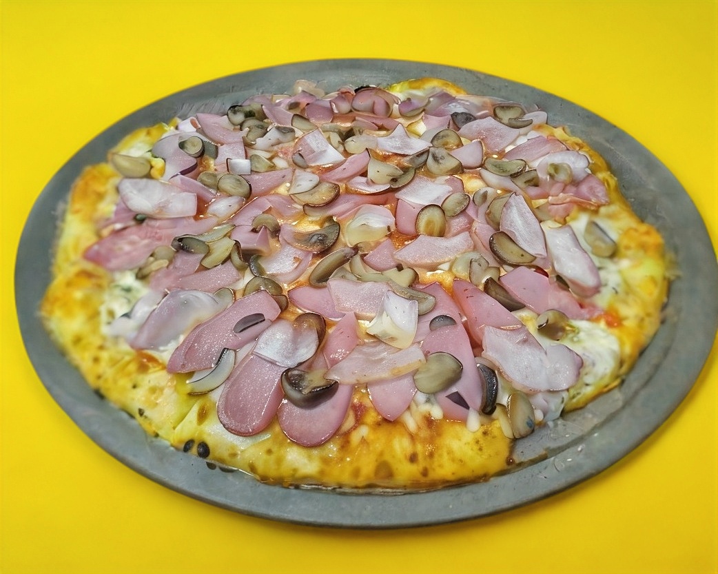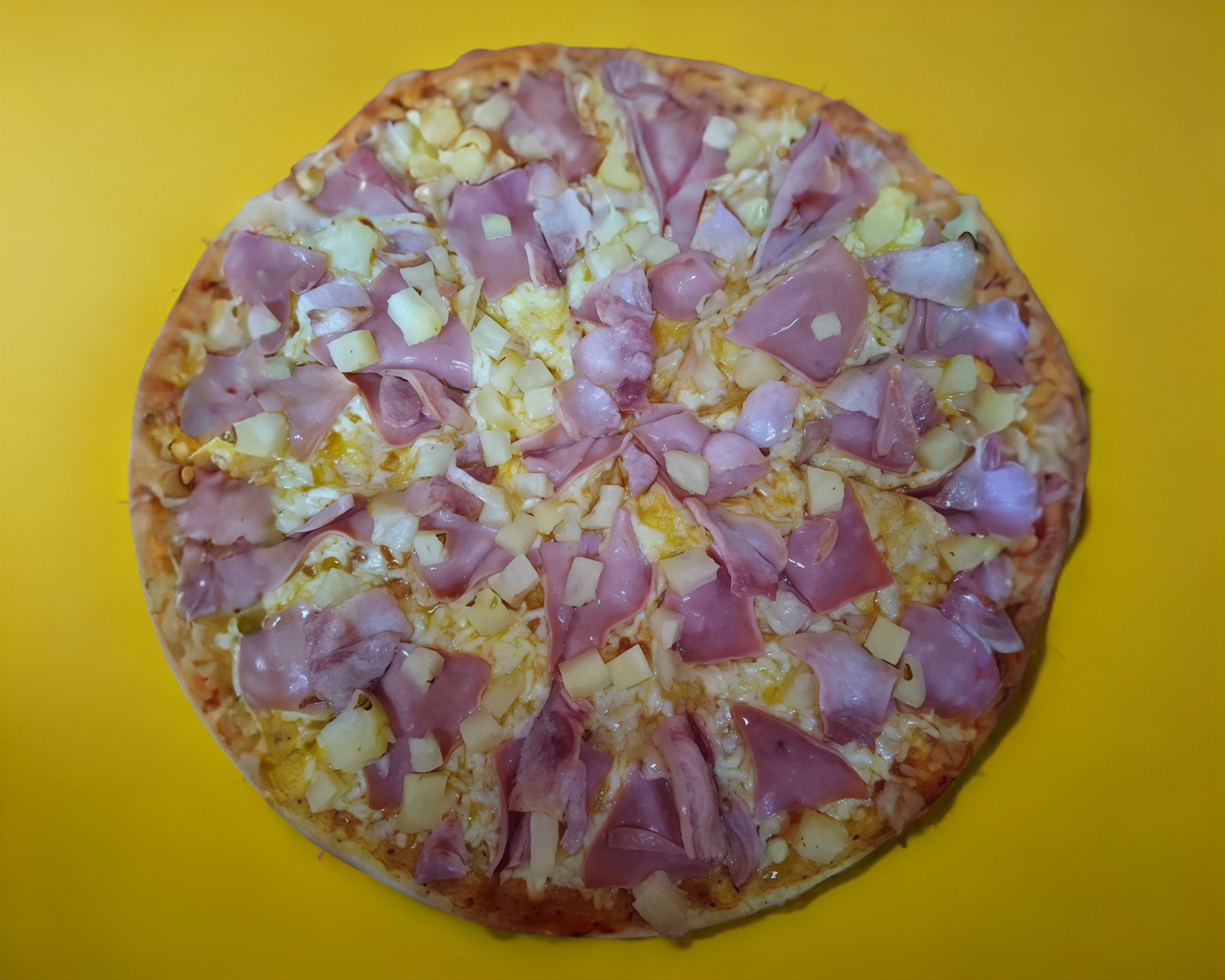Jamón, morrón, cebolla, piña, champiñón y tocino.