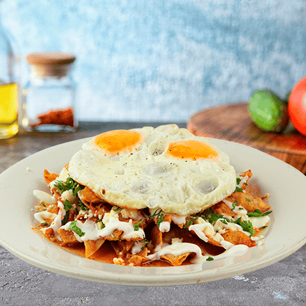 Dos huevos estrellados sobre chilaquiles bañados en salsa de tu preferencia. Con crema y queso fresco.