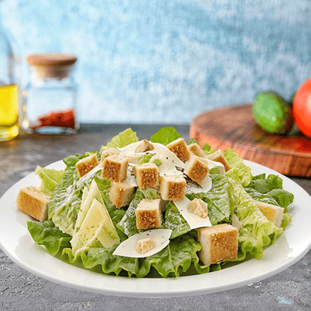 Mix de lechuga italiana, orejona y romana, acompañadas de crutones dorados, queso parmesano y aderezo césar.