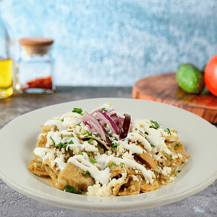 Totopos hechos de tortillas doradas bañados con deliciosa salsa roja o verde al gusto. Se sirven con crema, queso, cebolla y un toque de cilantro. ¡Una delicia crujiente por fuera y enchilada por dentro!