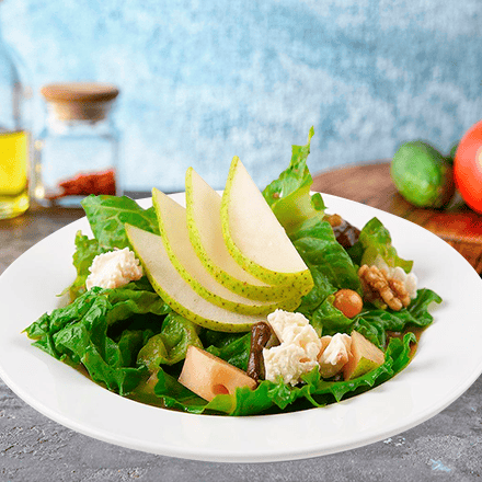 Combinación de lechuga italiana, pera, queso de cabra y nuez de castilla, con un aderezo de oporto, miel y aceite de oliva.