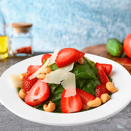 Espinacas frescas, fresas, nuez de la India y parmesano, con un toque de vinagre balsámico y aceite de oliva extra virgen.