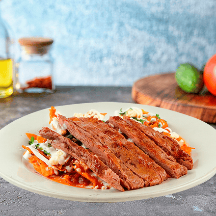 Totopos de la casa bañados en salsa de tu preferencia, acompañados con arrachera 130 gr, cebolla, frijoles refritos, queso fresco y crema.