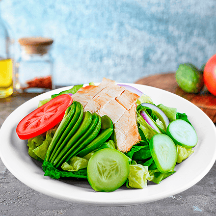 La ensalada con fajitas de pollo asado, mix de lechuga italiana, orejona y romana, aguacate, apio, pepino, jitomate, zanahoria, cebolla morada y crutones. Con aderezo al gusto.