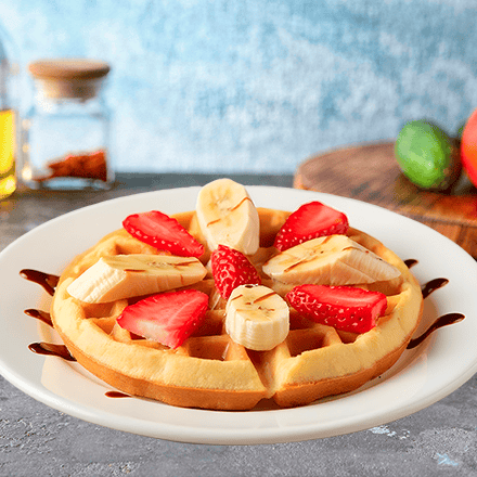 Un waffle preparado con nuestra deliciosa receta de la casa, acompañado con plátano y fresa bañado con chocolate o mermelada, o miel maple.
