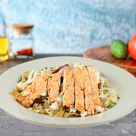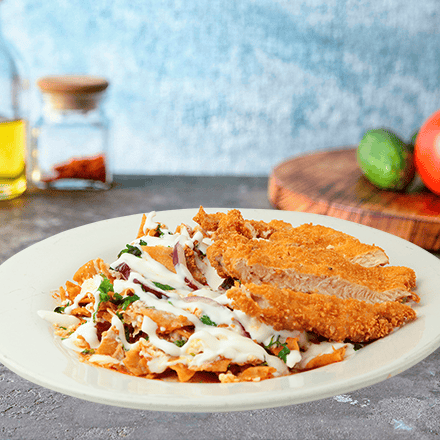 Totopos de la casa bañados en salsa de tu preferencia, acompañados con milanesa 130 gr, cebolla, frijoles refritos, queso fresco y crema.