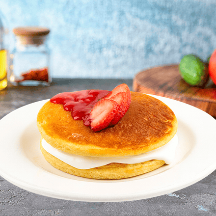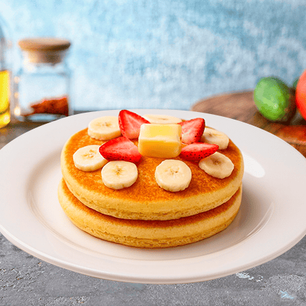 Dos hot cakes esponjosos preparados con nuestra deliciosa receta de la casa, acompañado con plátano y fresa bañados en chocolate o mermelada, o miel maple.