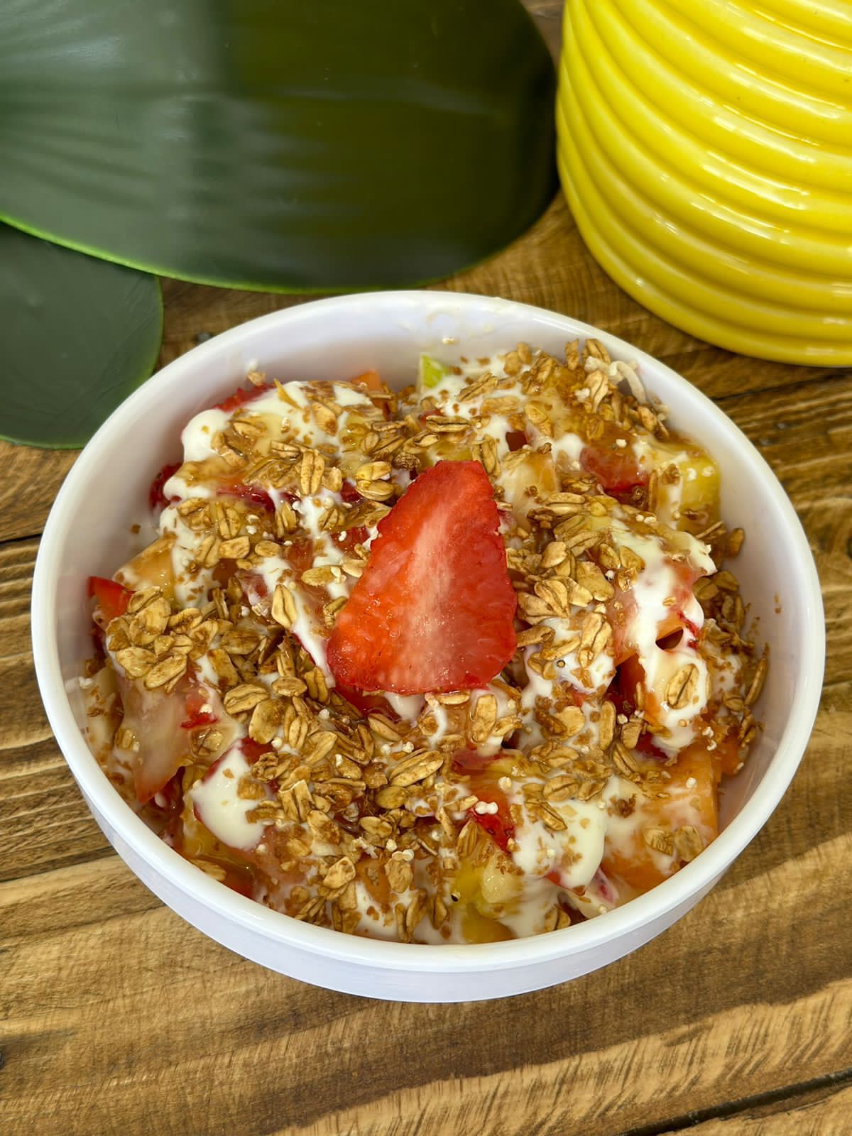 Ensalada de frutas acompañado de yogurt, miel y cereales.