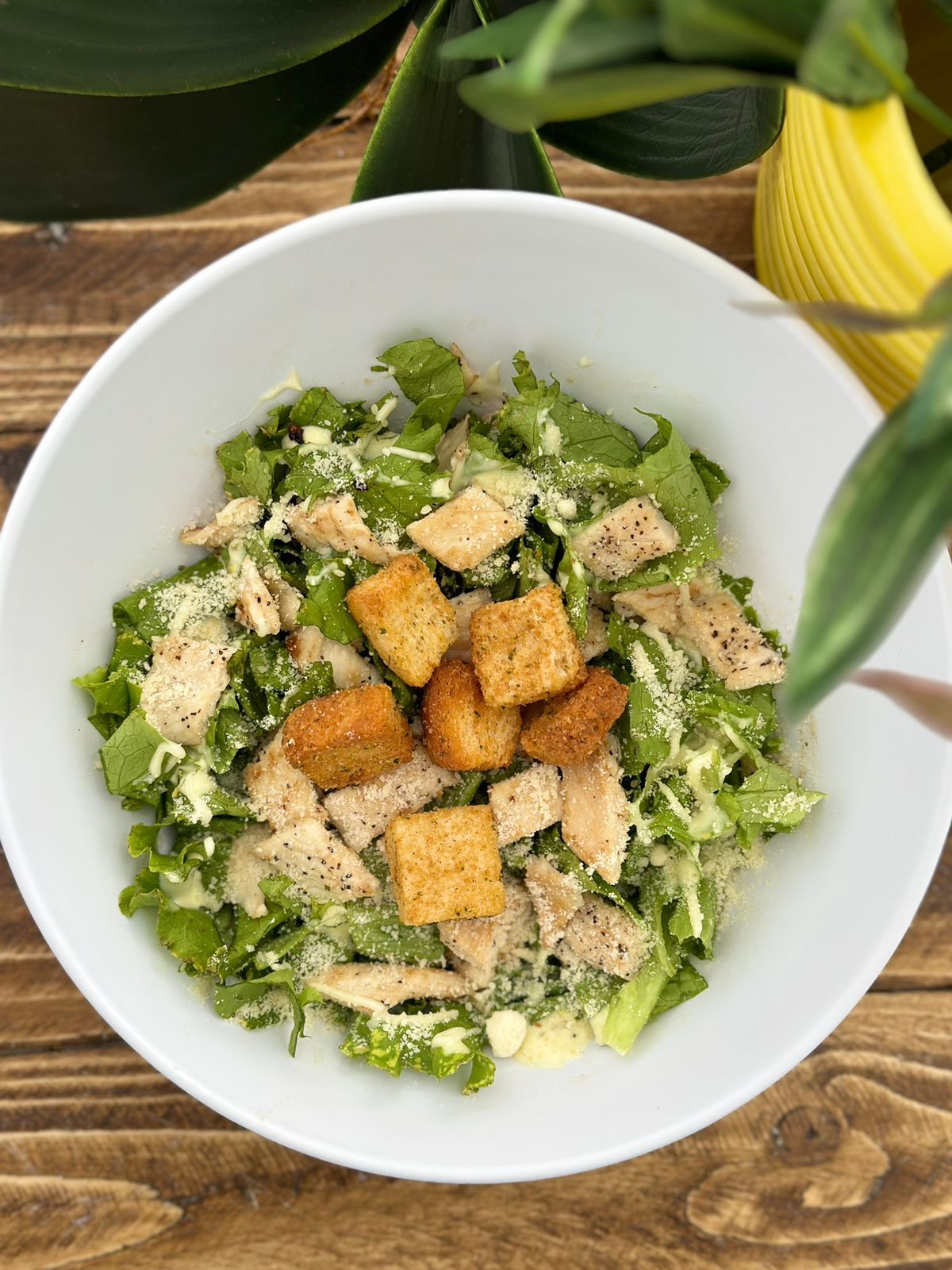 Mediana. Pollo a la plancha, aderezo César, parmesano y crotones.