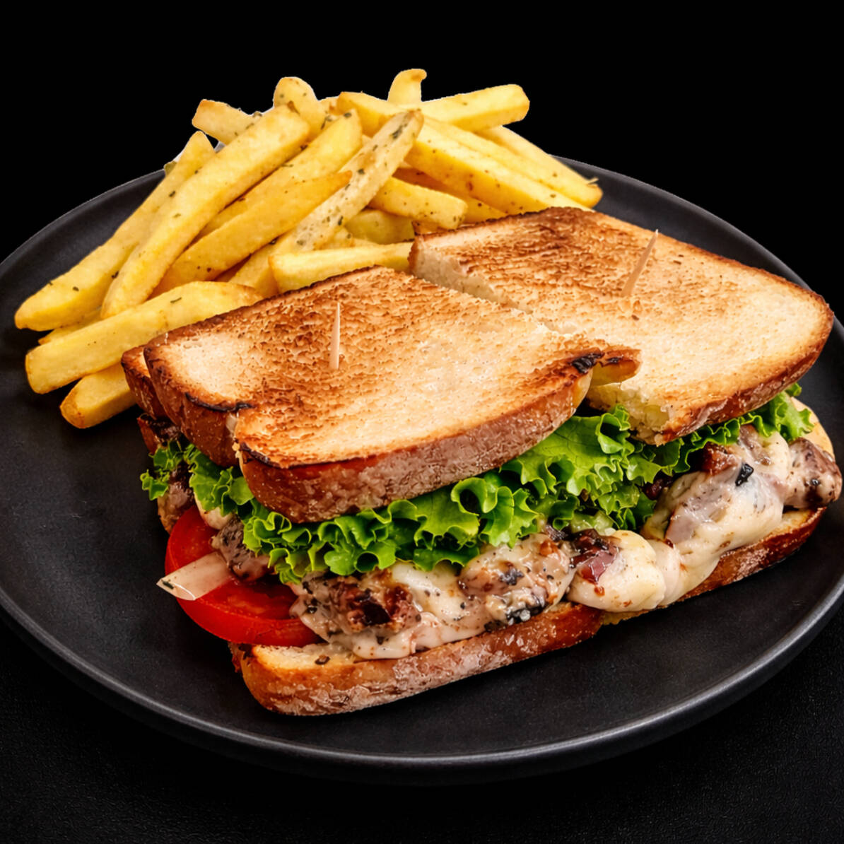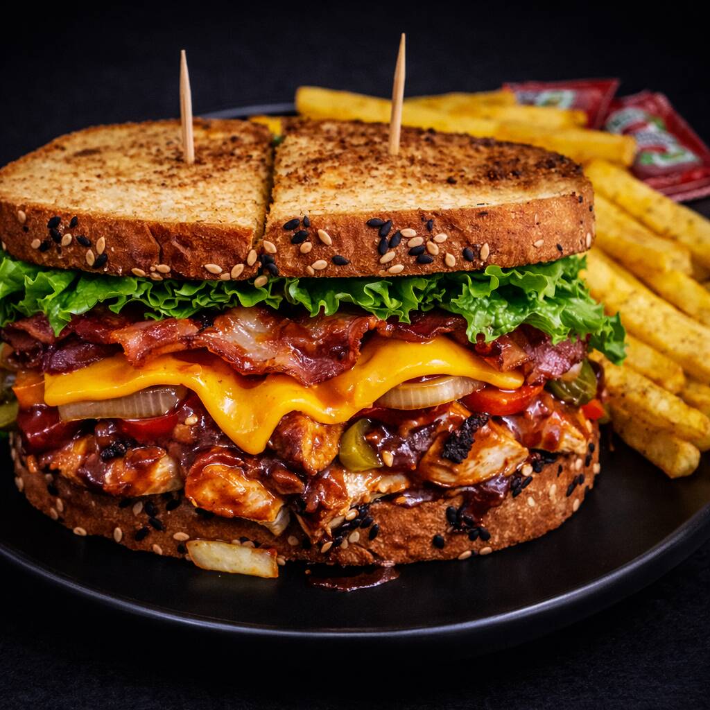 Sandwich de pollo a la plancha bañado en salsa BBQ, pimiento morrón y cebolla asados, tocino, queso americano derretido, pepinillos y lechuga, incluye un side para acompañar.