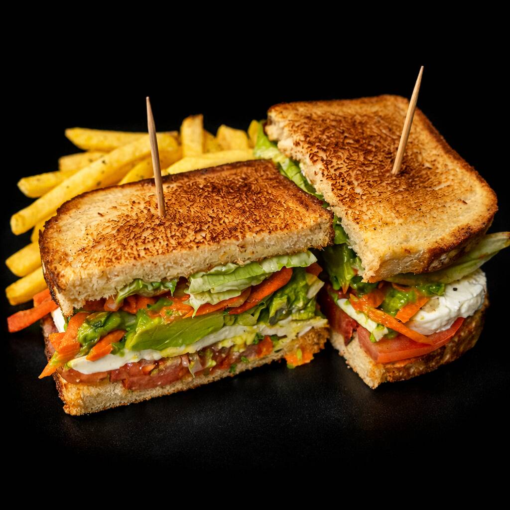 Sándwich ligero de aguacate (1 pieza completa), fresco queso panela, jitomate, lechuga, guacamole y lechuga, incluye un side como acompañante.