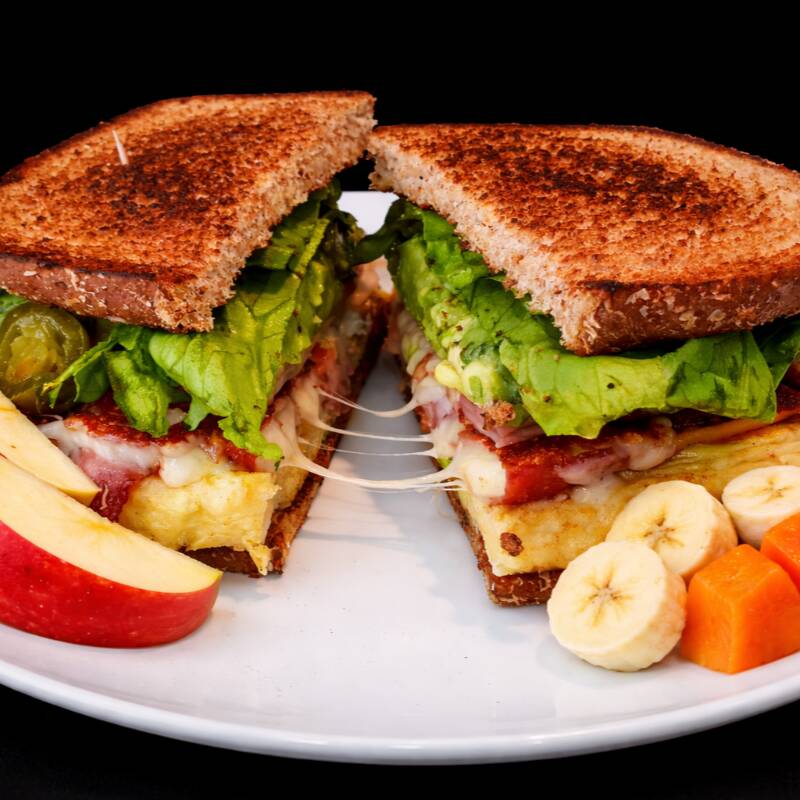 Sándwich de jamón con queso asadero, queso amarillo, tocino doradito, chiles jalapeños, mayonesa, jitomate, cebolla y lechuga, incluye un side para acompañar.