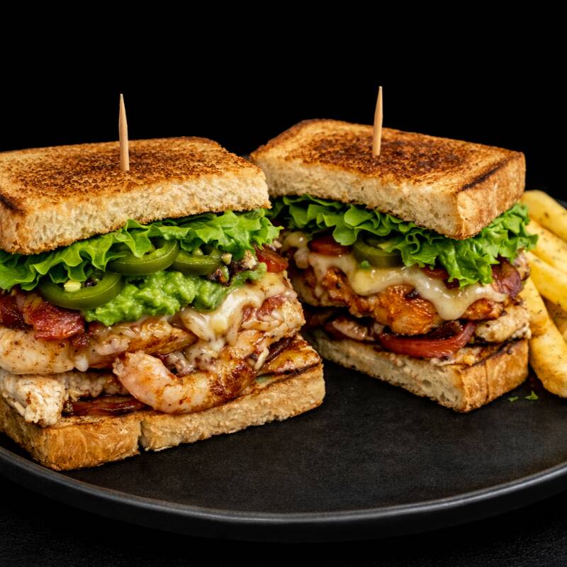 Sándwich de pollo a la plancha con camarones sazonados al grill, cubiertos en una capa de queso derretido, con tocino, guacamole, y chiles jalapeños, incluye un side como acompañante.