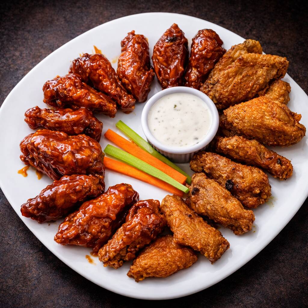 Alitas bien doraditas bañadas en la salsa de tu elección, acompañadas de aderezo ranch y trocitos de zanahoria y apio.