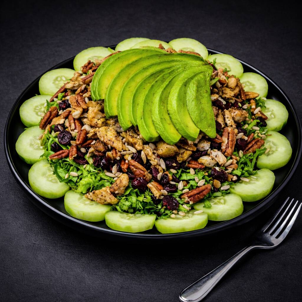 Lechuga, pepino, arándanos, nuez, semilla de girasol, aguacate, salsa inglesa y 150 gramos de proteína a elegir.