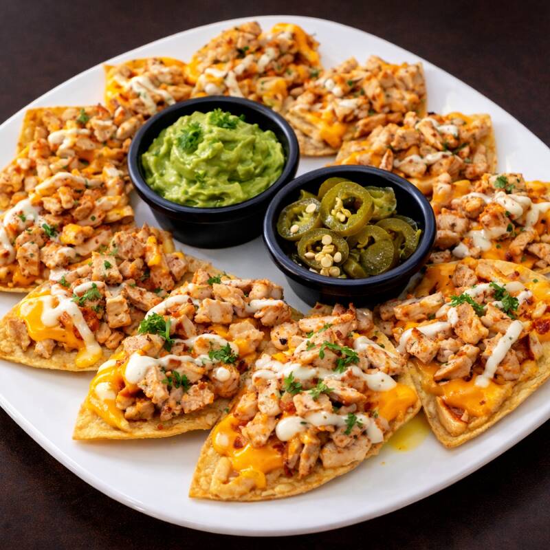 Nachos hechos a base de rica y saladita tostada de maiz, cubierta con una capa de frijoles refritos, queso asadero, queso amarillo derretidos, 150 gramos de pollo o arrachera, acompañados de guacamole (aparte) y chiles jalapeños. 12 Piezas de nachos.