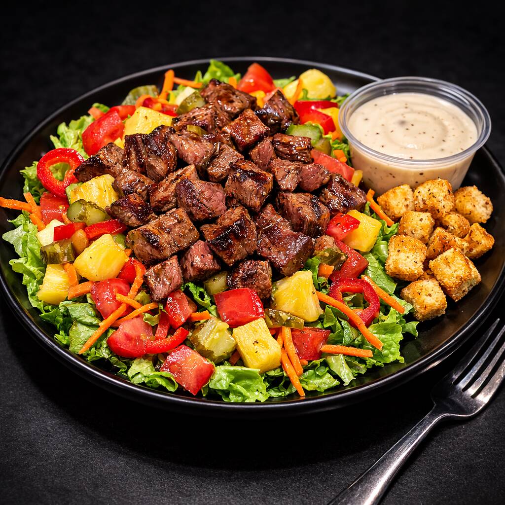 Lechuga, jitomate, pimiento morrón, piña, zanahoria rayada y pepinillos, aderezo y proteina a elegir.