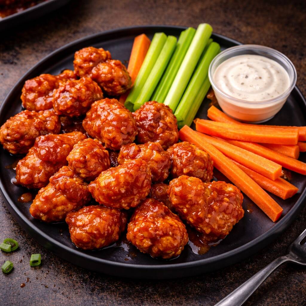 Boneless con tu salsa favorita, papas a la francesa, trocitos de zanahoria y apio y aderezo ranch.