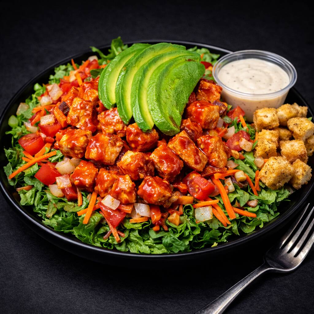 Lechuga italiana, zanahoria rayada, jitomate, cebolla asada, pollito a la plancha bañado en salsa bufalo de alitas, aderezo ranch, crutones y aguacate!